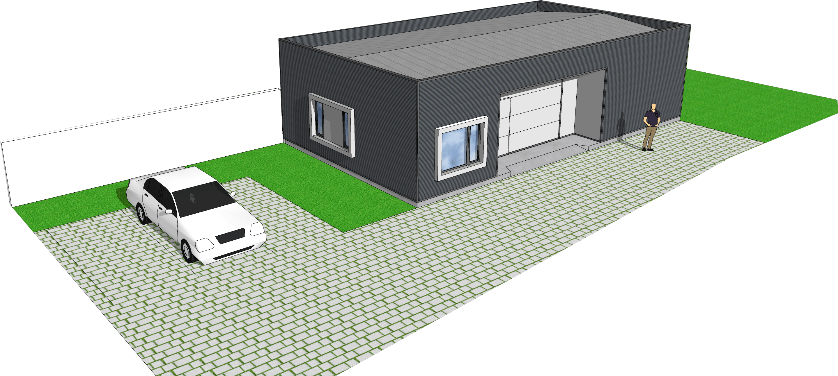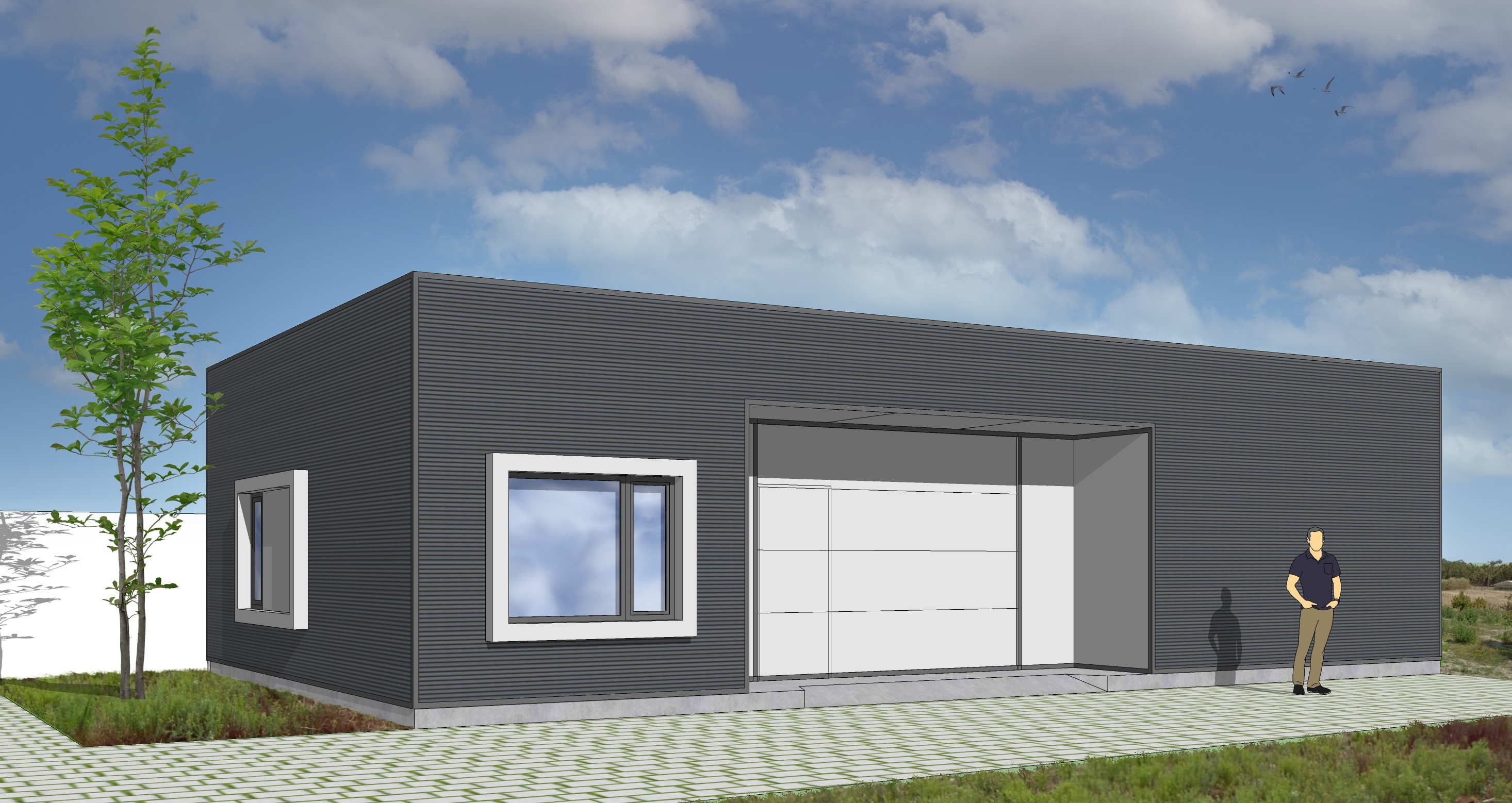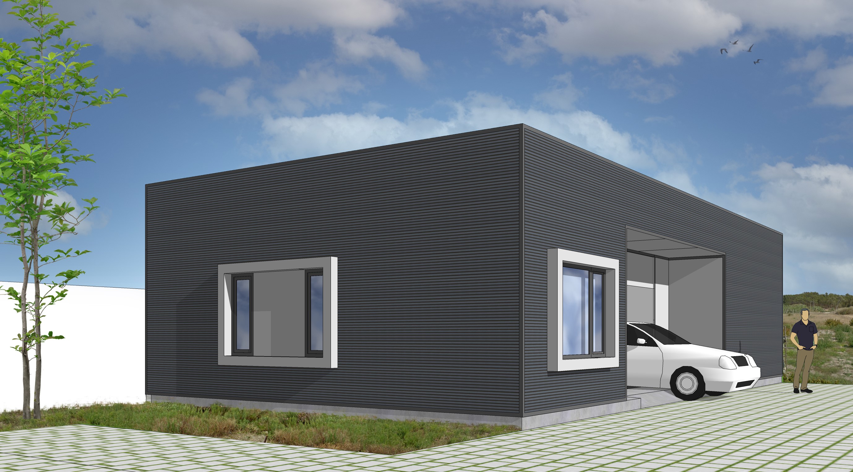 Volume-wise, the proposed building has simple lines, drawing a parallelepiped covered with a dark grey ribbed sandwich panel, which contrasts with the void created by the porch, covered with a smooth, light grey panel. The openings are marked by a metal frame, finishing it off.