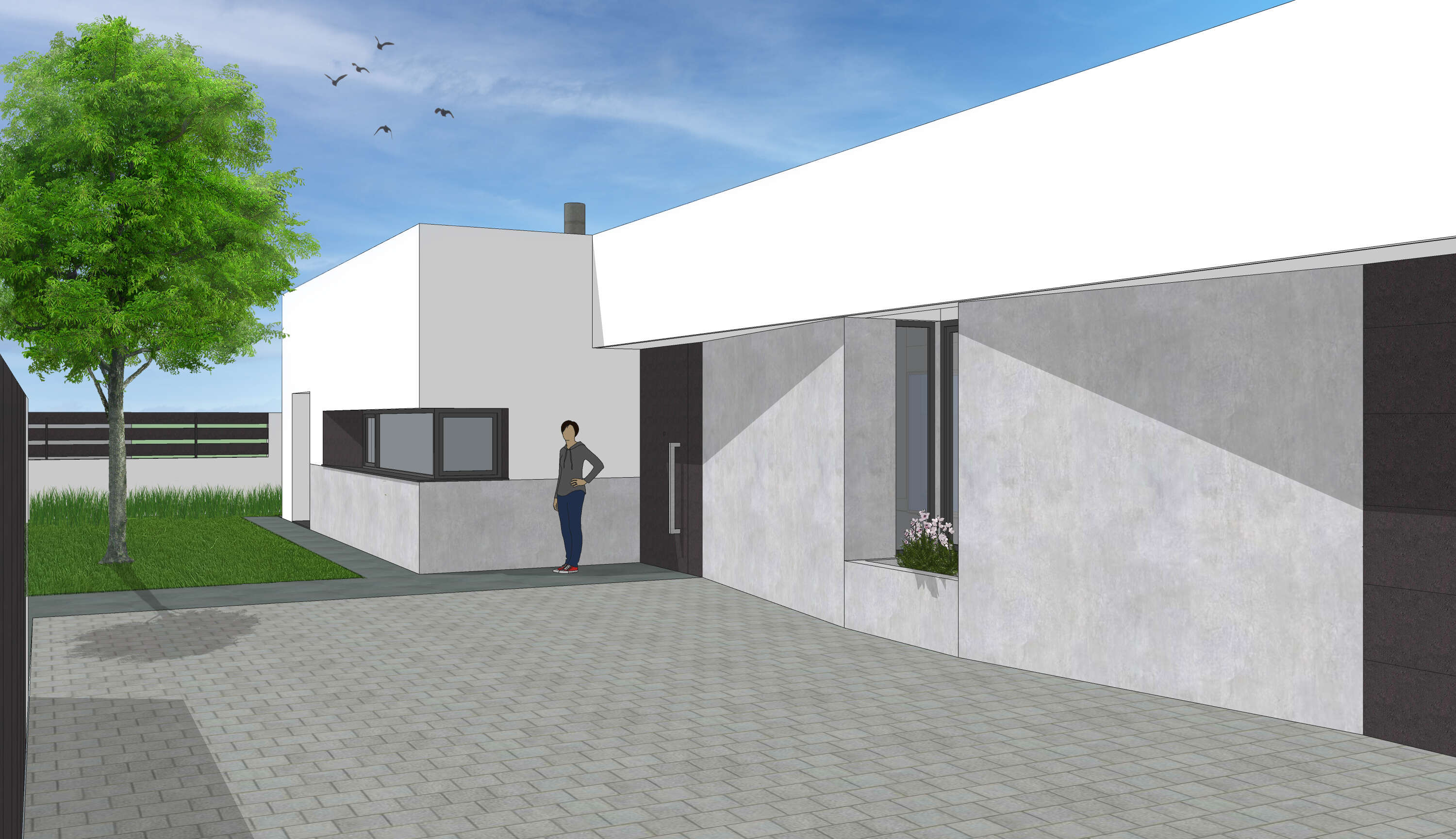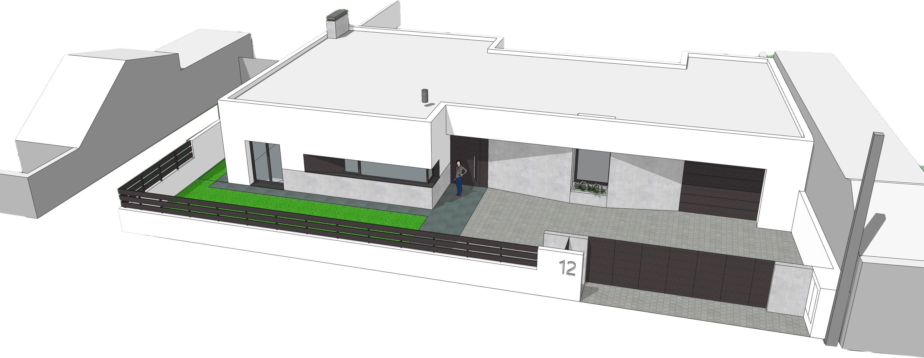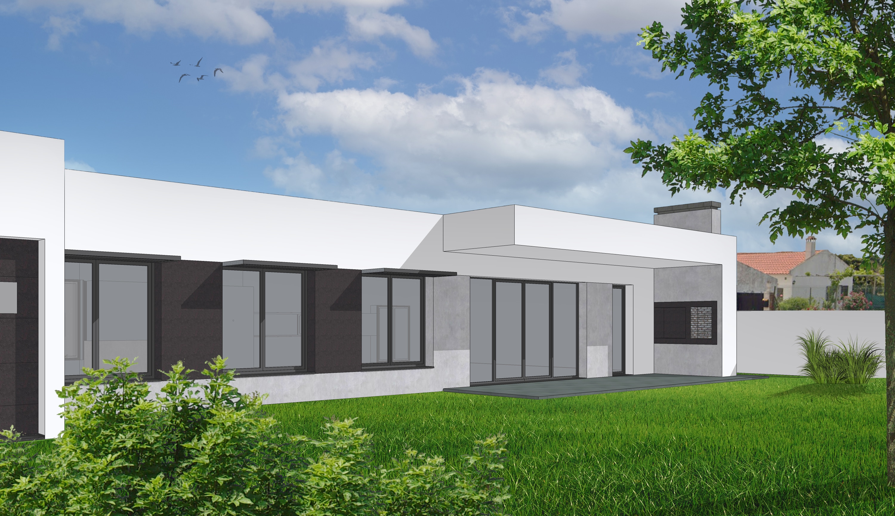 Volumetricamente, a construção principal referente à moradia unifamiliar, desenvolve-se em apenas um piso, tirando partido da pouca diferença de cotas existente na propriedade, permitindo uma perfeita mobilidade interior / exterior e acessibilidade com o arruamento principal. A dinâmica formal é materializa por 3 elementos: branco, cinza escuro e revestimento texturado cinza claro, destacando-se um elemento marcante na entrada, no qual dois planos não ortogonais definem uma floreira de enquadramento do espaço de estar interior sito no corredor. A tardoz o prolongamento da platibanda e cobertura determinam a área coberta de alpendre, que orientado a sul, potenciará também um excelente elemento de sombreamento, importante para a dinâmica bioclimática que a proposta apresenta.