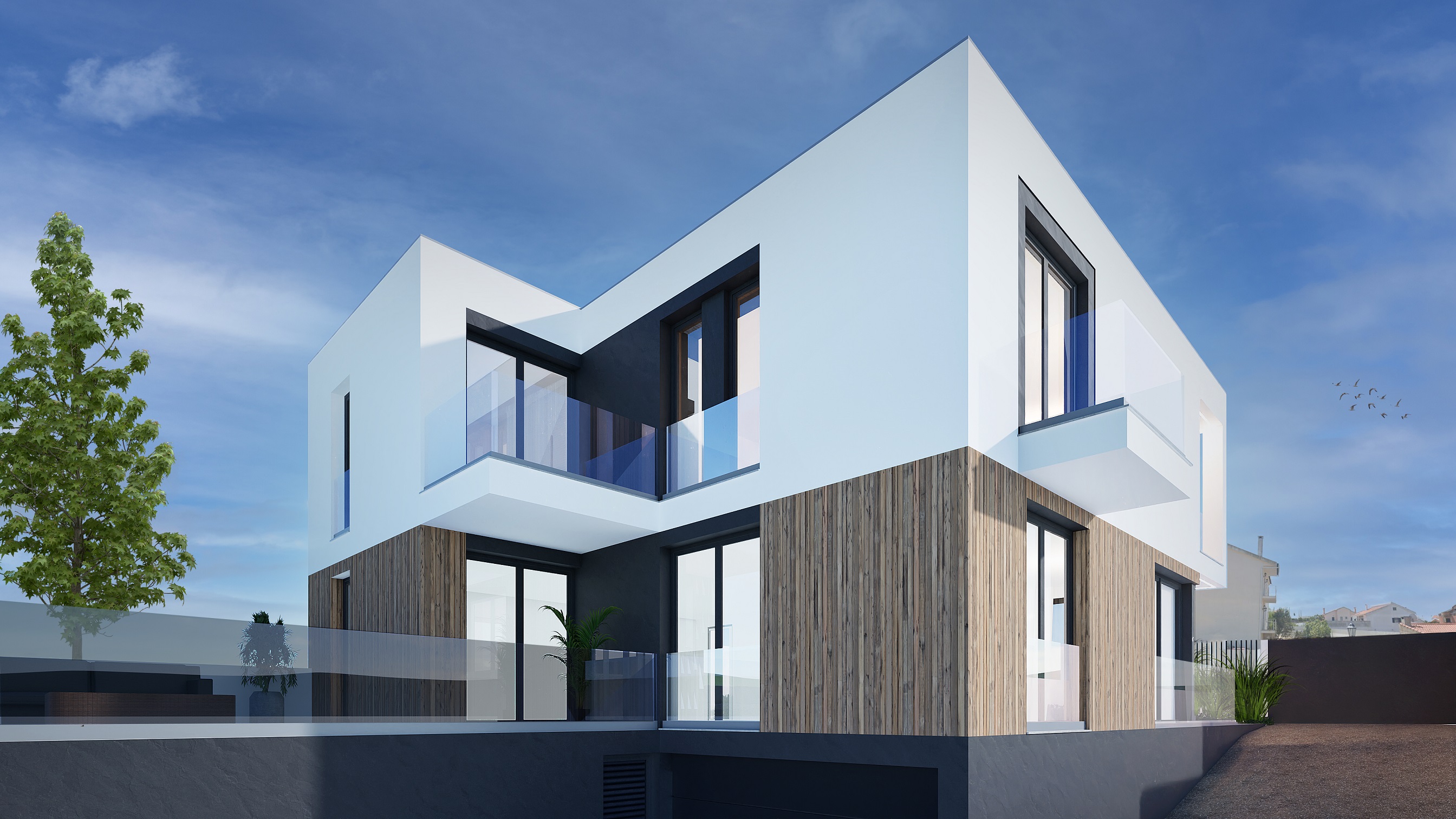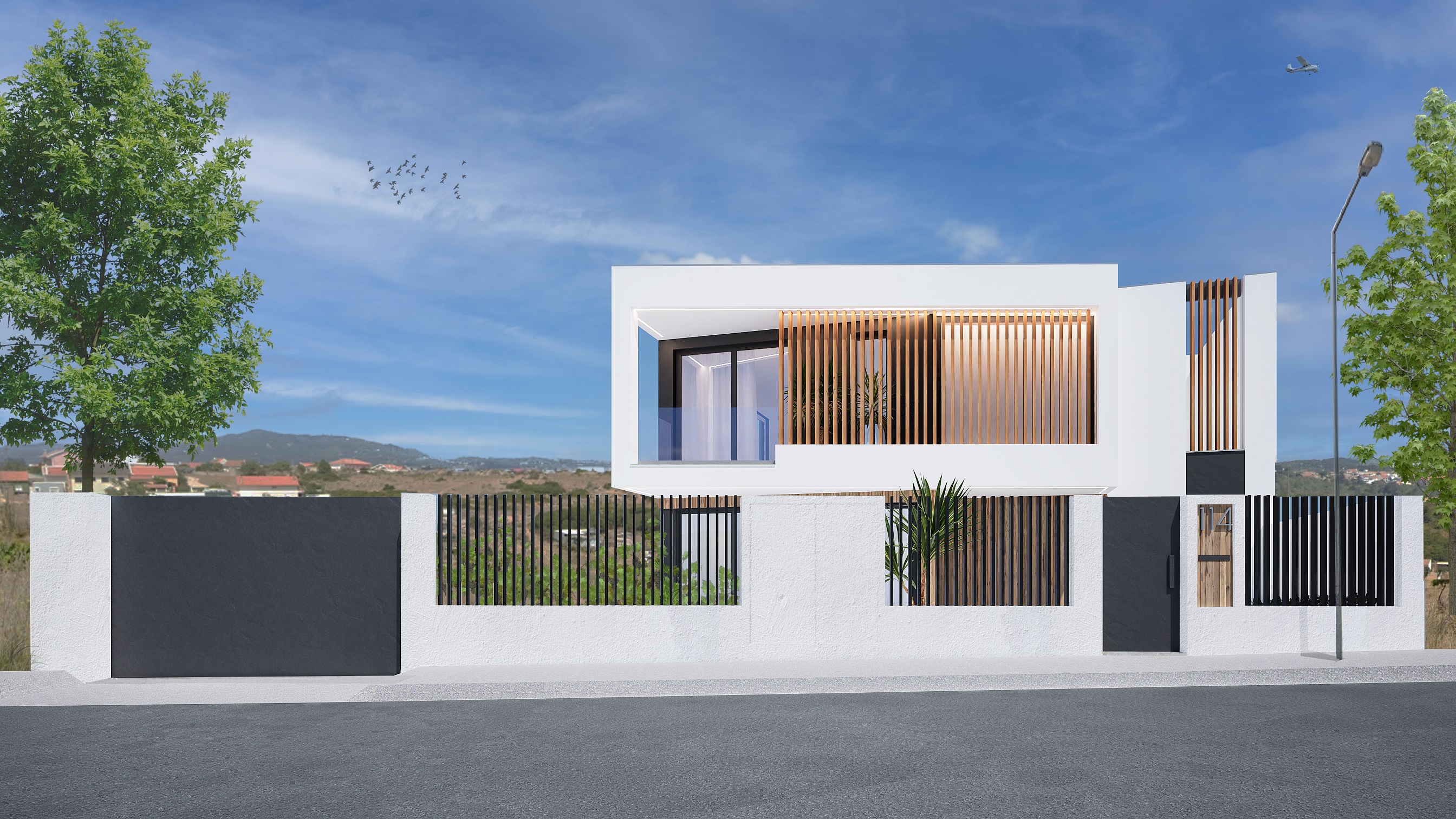 O projeto desenvolve-se em 3 pisos, dois acima da cota de soleira e um em cave (estacionamento). Uma vez ultrapassada a entrada, deslumbra-se um hall, distribuidor, quer ao piso superior, quer ao piso da cave. O acesso vertical ao piso superior é efetuado por uma escada “suspensa”, encastrada na parede, com uma guarda em vidro que de forma continua, irá ligar este acesso ao acesso do piso inferior. O hall culmina para um espaço amplo de sala com ligação ao espaço da cozinha, equipada, com funcionamento centralizado na ilha, e que permite uma vivência conjunta. No piso superior encontram-se 3 suites, com destaque para a principal, composta por closet, hall e instalação sanitária e com acesso a uma cobertura exterior ajardinada. Na cave existem 2 lugares de parqueamento, um espaço para arrumos, um espaço para área técnica no qual estará inserida a bomba e demais acessórios para o funcionamento da piscina e ainda uma instalação sanitária. Volumetricamente, a moradia apresenta uma linguagem moderna, com a linha reta a evidenciar-se nos grandes planos salientes que proporcionam varandas pontuais, que servem a cada uma das suites, sendo que funcionam, em simultâneo, como “palas” de sombreamento, conferindo características bioclimáticas, a poente e sul. As guardas em vidro, garantem a proteção e segurança, não obstruindo a vista e a passagem da luz natural para o interior. A iluminação exterior, em fita e focos led, terão um relevo especial nas características ressalvadas, sendo que dão aos planos um contorno adicional, modernidade e funcionalidade. A madeira é o material eleito e que, em forma de ripado - opaco ou espaçado - criam um jogo de cheio vazio, luz e textura que tentam diferenciar o desenho geral. Os vãos são de forma geral de 2 folhas, oscilo batentes e com uma área envidraçada ampla. Na sala destaca-se o envidraçado para a piscina, que pretende aumentar a sensação de continuidade entre interior e exterior.